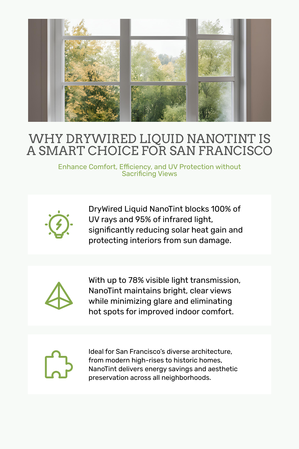 Despite its powerful heat-blocking capabilities, DryWired Liquid NanoTint does not compromise on natural light. It maintains up to 78% of visible light transmission, allowing for bright and clear views without the drawbacks of increased heat or glare. This balance makes it an ideal choice for San Francisco’s homes and businesses, where maximizing natural light while minimizing heat gain is essential.